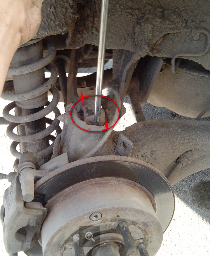 так вот сегодня снял колесо, решил сам "пошатать", тот рычаг который - полумесяц, должен свободно смещаться по горизонтали? может быть в нем дело? с обоих сторон подвески - одинаково. Там, где обвел кружком, ход приличный около сантиметра и на себя и от себя.