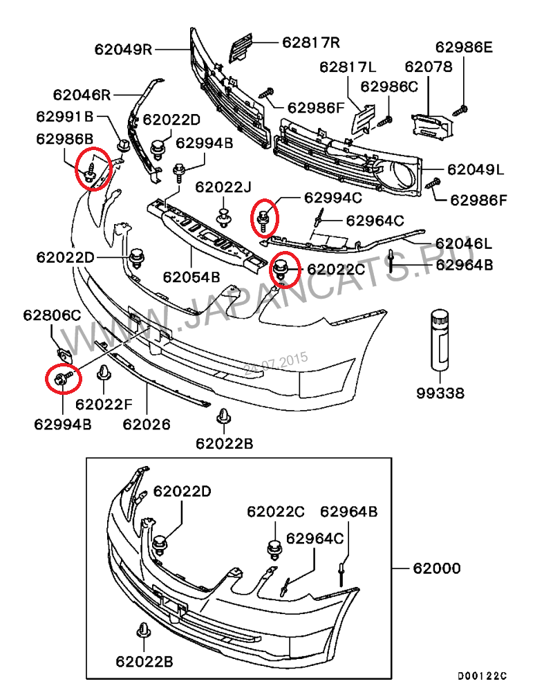 То что ты обвел на схеме, никак не влияет на крепление бампера к этому кронштейну. Бампер прикручивается к нему болтом 62944B в левом нижнем углу на твоей схеме, через закладную в бампере в центральном углублении за номерным знаком