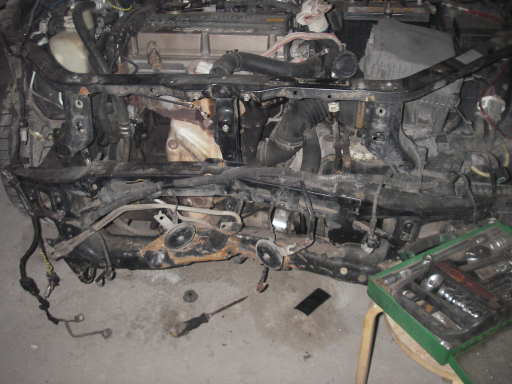 да, забыл описать события, приключившиеся с предыдущим владельцем-он имел неосторожность врезаться то-ли в пень, то-ли в большой камень (я слышал разные версии), потом возник легкий пожар под капотом из-за того, что вентилятор нежно обнял турбину, но был вовремя локализован и устранен полторашкой пива. на этом череда несчастий не прервалась, из-за сильно кривого "телевизора" в один прекрасный момент на скорости 130 км.ч. открылся капот...