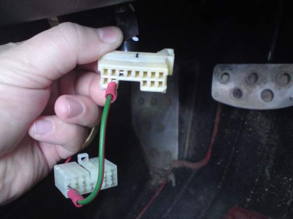 Разьем OBD2 и доп.разьем находятся под рулевой колонкой, вот к ним и подключаемся. OpenPort 1.3 Made in Russia имеет сервисный доп.разьем не подходящий по форме к штатному разъему Airtrekа. Решение простое - если не жалко разъем, то его отрезаем и припаиваем(обжимаем) к проводу контакт в виде "папы" или же делаем перемычку-проводок как на фото. Рефлеш коннектор на штатном разъеме - зеленый провод. См. фотку.