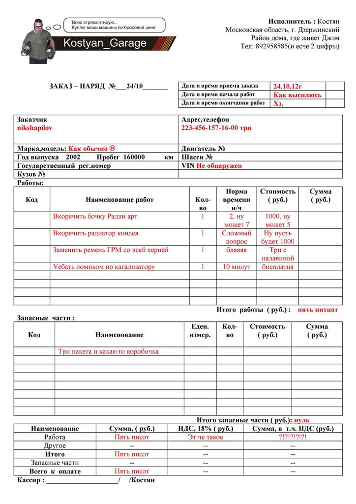 Так как Костян человек занятой и сервис у него серьезный, чтобы он ничего не забыл и чтобы не доёбывать его звонками, решил сделать форму заказ-наряда для Костяна.