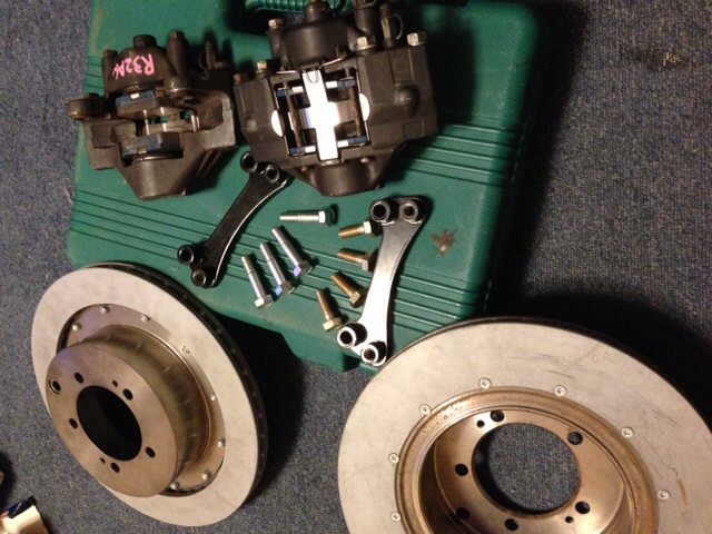 Диск - составной 320*20, суппорта - Nissan Skyline GT-R, переходники цельноточенные стальные, колодки - ХЗ какие, но похожи на кебоно керамику.