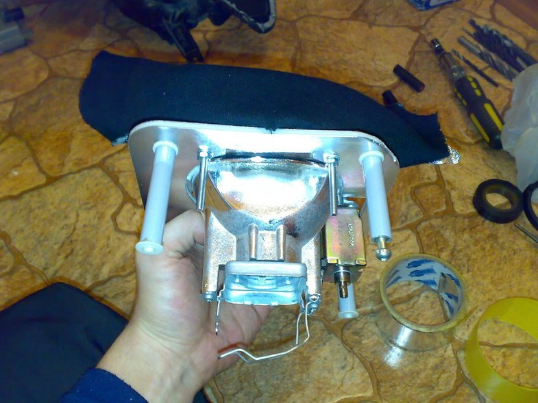 2) убрать родной отражатель, рассчитать и изготовить пешеходную пластину и натянуть от линзы черную ткань.