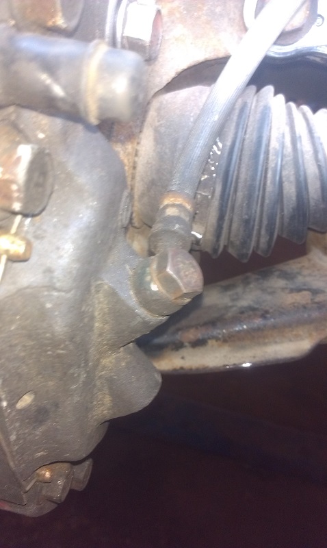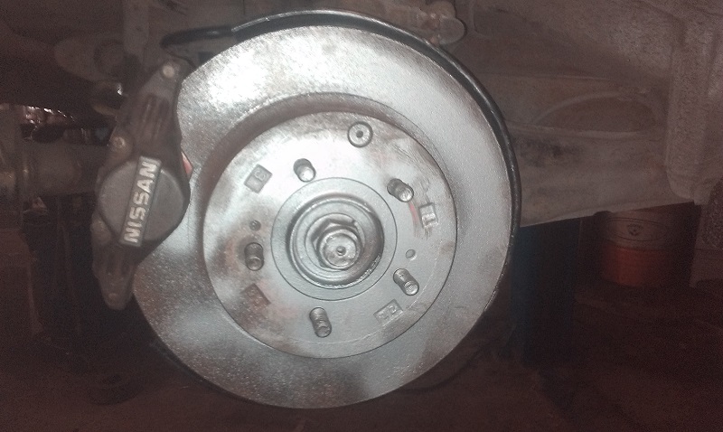 После установки суппортов вылез таки небольшой геморрой: родной шланг слишком короткий, чтобы его можно было вкрутить в ниссановский суппорт. Пришлось заменить его на передний шланг от эклипса с банджо, также вынув из суппортов конусные вставки.