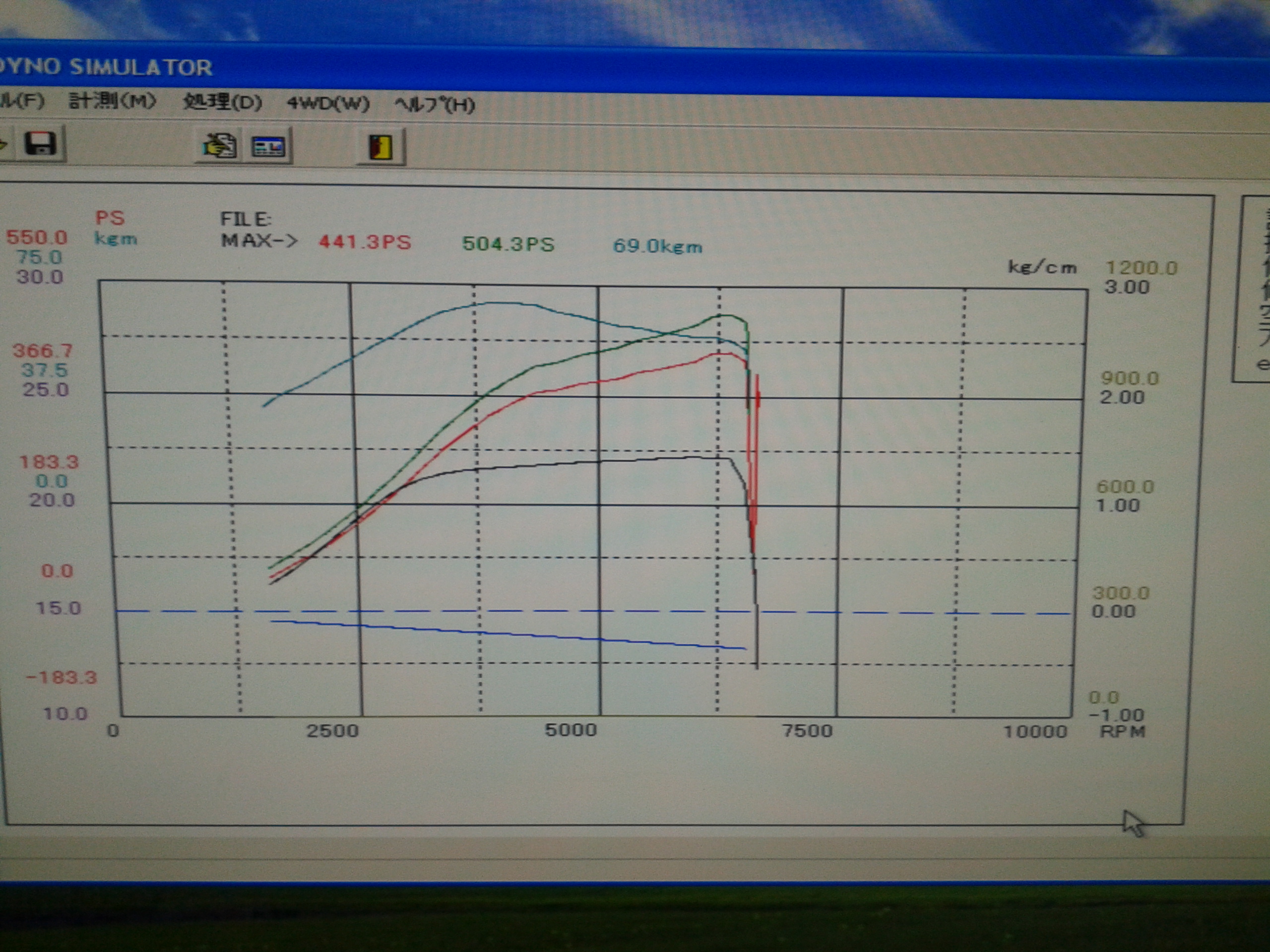 441 л с на колесах))ну и момент 69 кг на наддуве 1.45 кг на 110 спорт топливе.