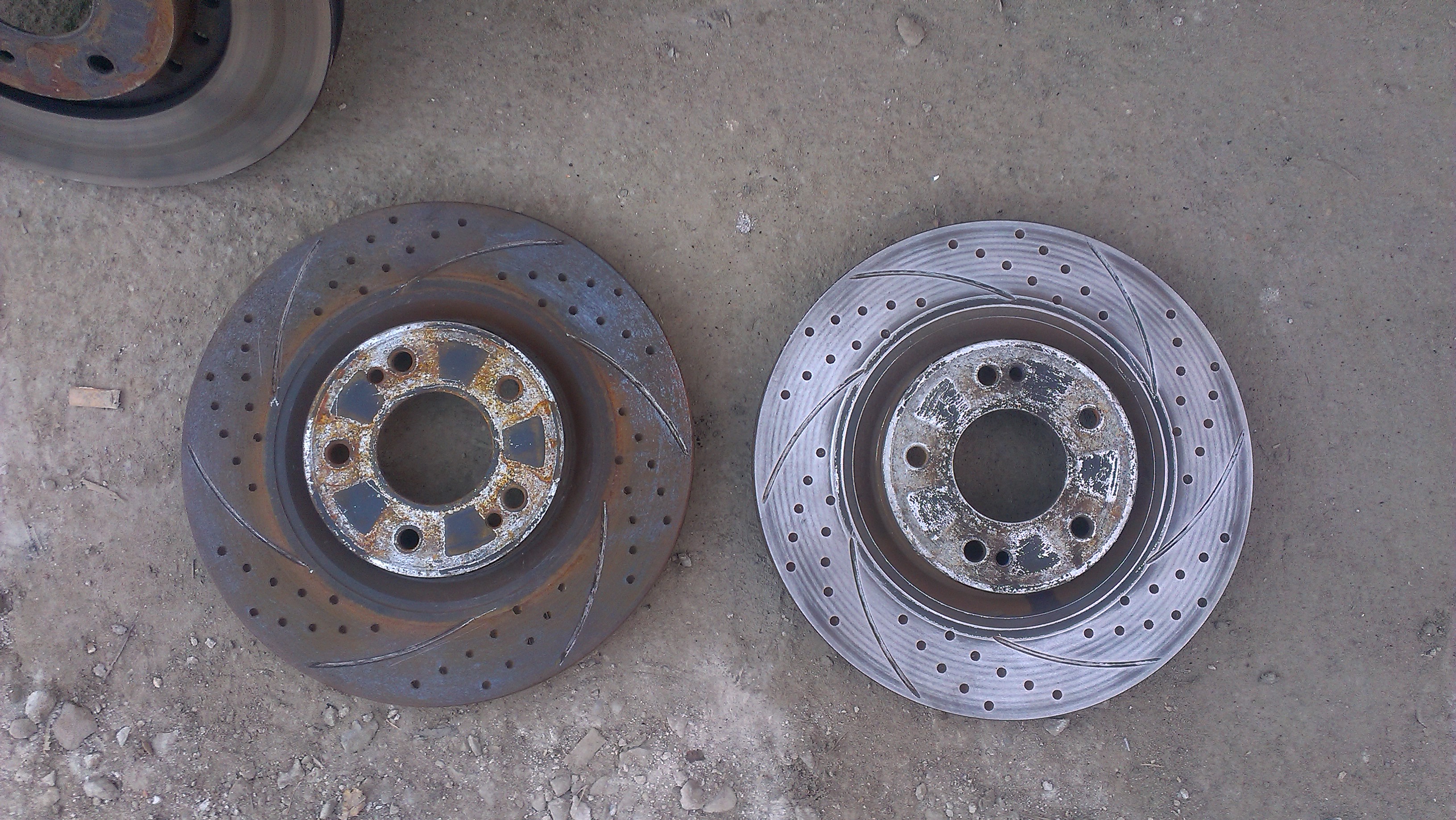 Передние тормозные диски с насечками и дырдочками, наилютейшие!!! Состояние новяк, внутри даже ржи нету, ещё в краске всё, только снаружи немного покрылись ржой, которая легко снялась наждачкой вручную.
