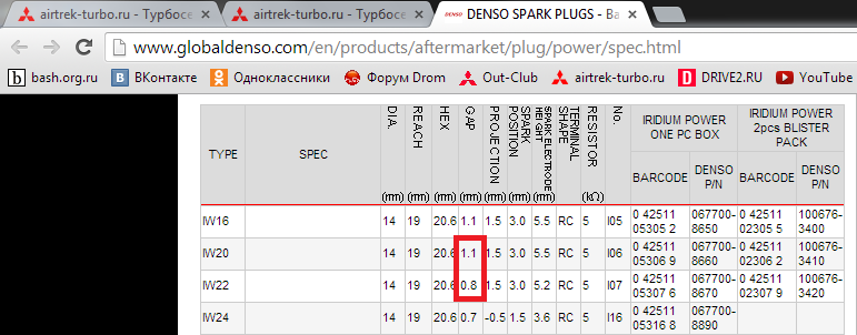 ты не прав. Там зазор указан для обычных свечей. Вот зазоры иридиевых http://www.globaldenso.com/en/products/ ... /spec.html