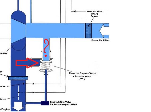 давление давит на клапан внутри байпаса, за счёт давки, через ту самую трубочку, создаётся доп подпор и не даёт открыться клапану, как только перестаёт надувать, избыточное давление продавливает клапан и давка выходит обратно во впуск.