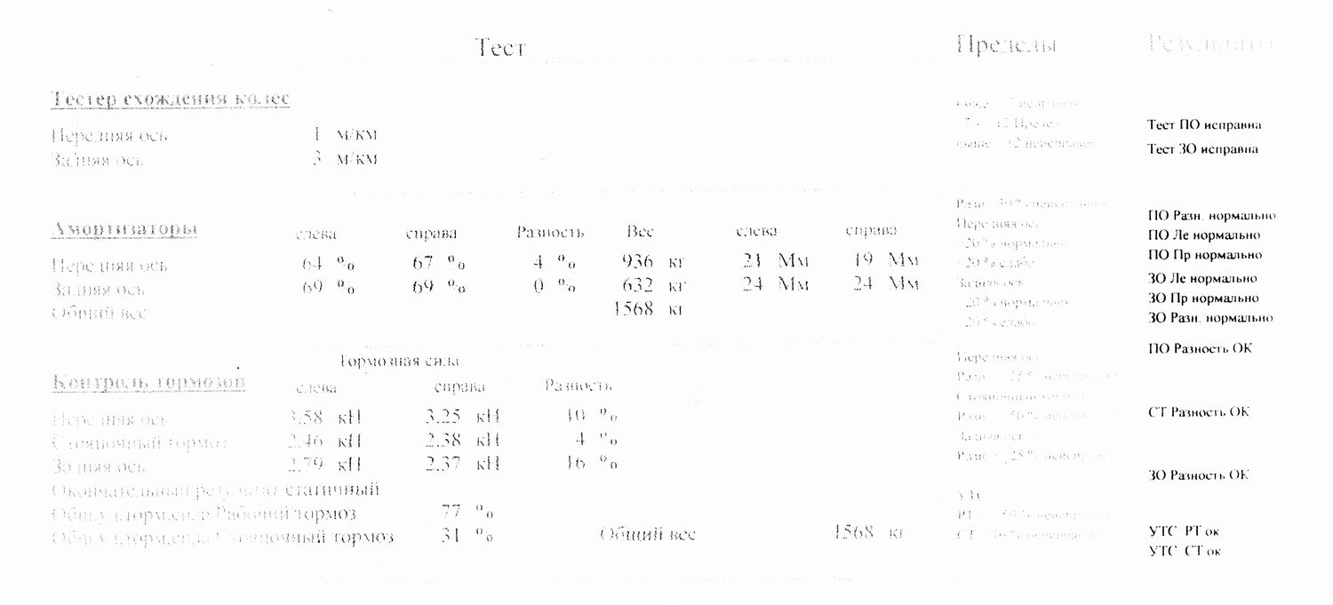 в процессе диагностики машину взвешивали и вот интресный факт вес машины с полным баком 1568 кг., перед 936 кг, зад 632кг, но в Диагностической карте занесли такой же как в птс 1690 кг.