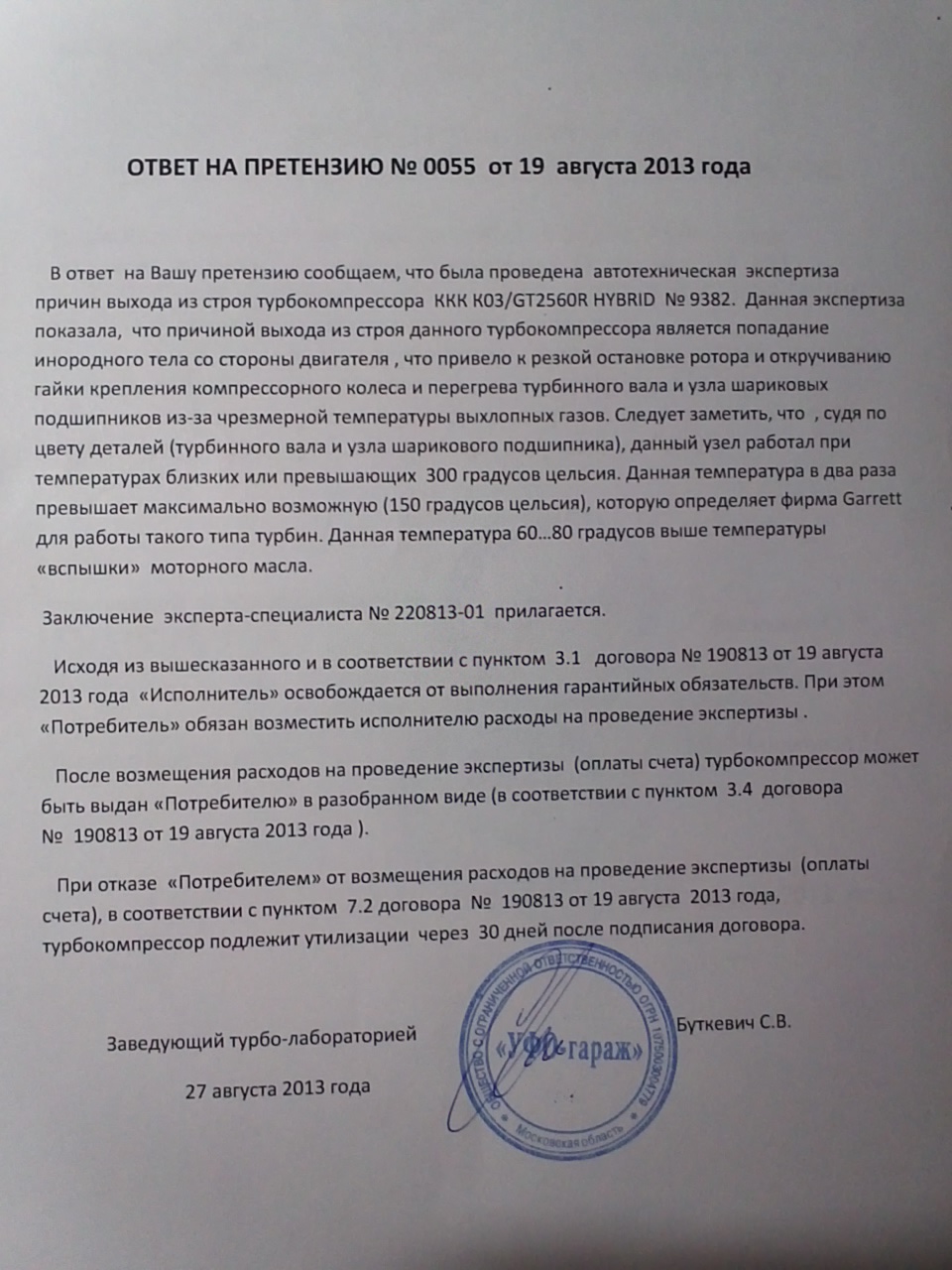 Получили мы наконец то ответ на претензию, заключение эксперта. Почитал и поржал и особо не удивлен написанному. Наверно гайка или болт м14 откуда то взялся и развалил мне турбу) Не сомневаюсь что экспертная контора повязана. Причем с доками турбу так и не прислали. Делал документы в 2х экземплярах с живыми печатями, в ответ пришли черно-белые копии. Говорил мне друг, не связывайся с ними.(он отдавал на ребилд турбу с дизельного мотора какого то. Не более чем через 5000км померла.). В общем в турбо лаб ни ногой!